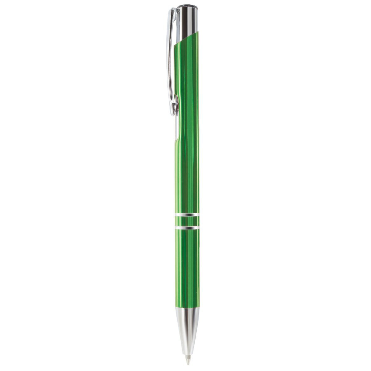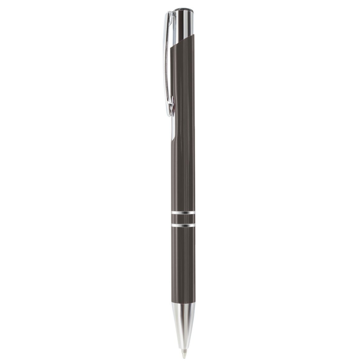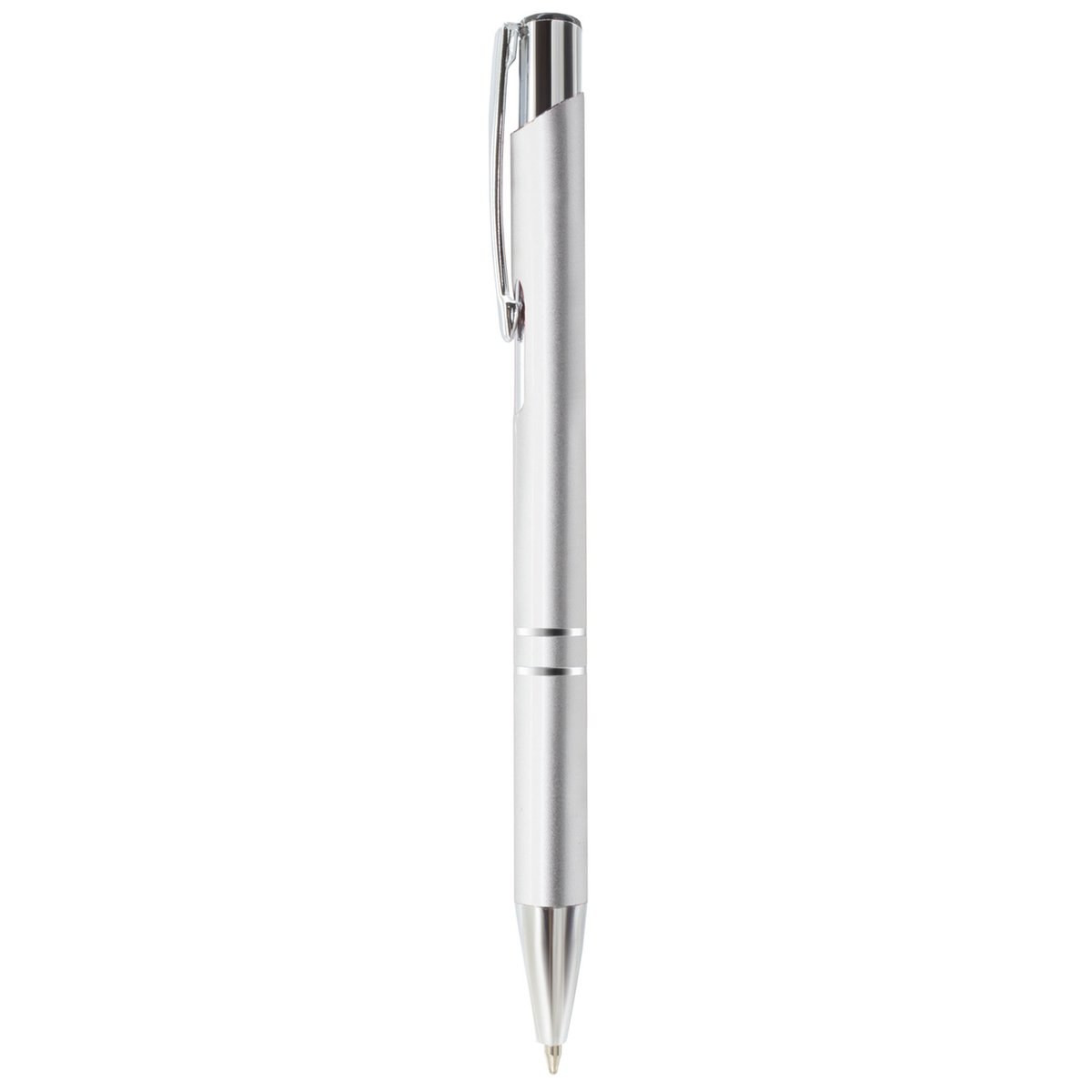 Penna a sfera con meccanismo a scatto, design elegante. Corpo in alluminio, disponibile in vari colori. Clip, anellini e puntale silver. Refill jumbo, inchiostro blu
