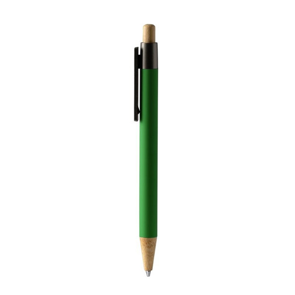 Penna a sfera in metallo con finitura gommata, meccanismo a scatto, pulsante in bambù. Ampia clip in bambù ideale per essere personalizzata. Inchiostro blu.