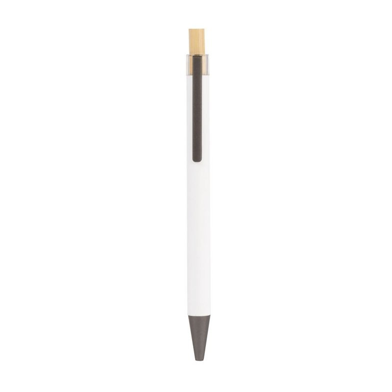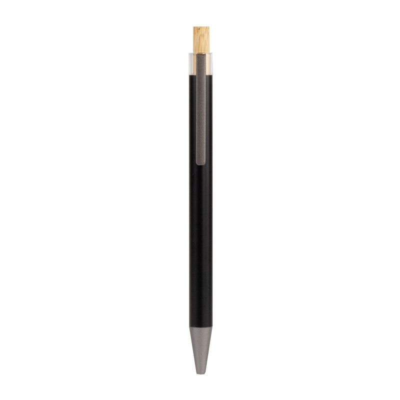 Penna a sfera con meccanismo a scatto, realizzata in alluminio riciclato, finitura opaca, con pulsante in bambù. Simbolo del riciclato sulla penna. Inchiostro blu.