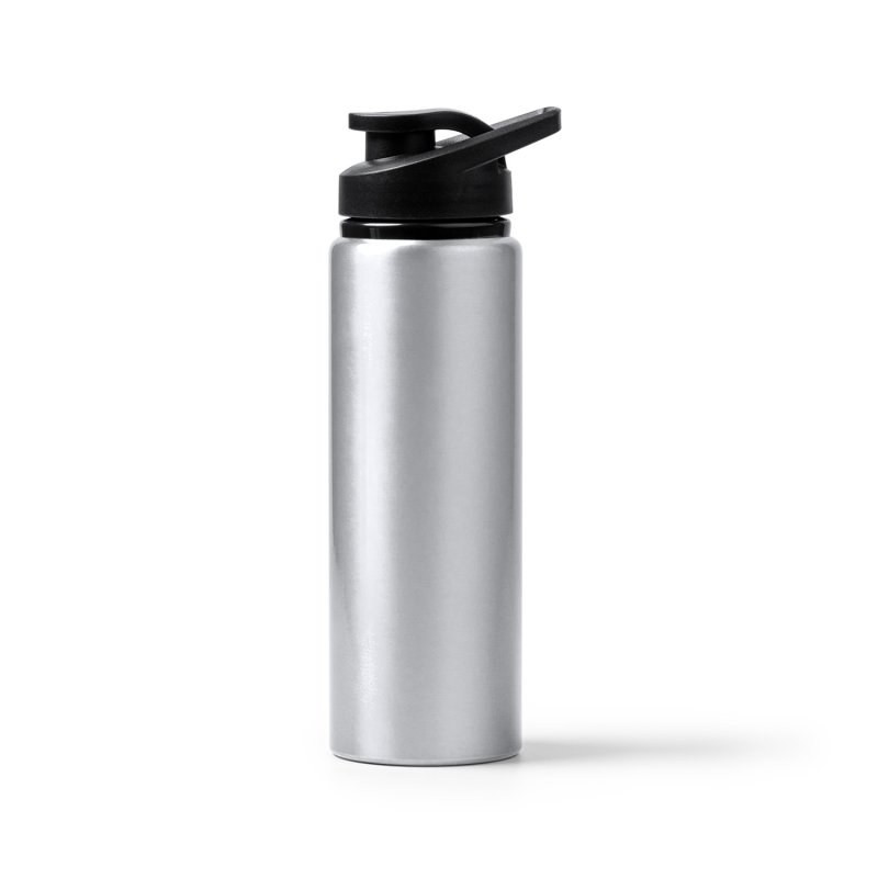Borraccia in alluminio riciclato con finitura metallizzata. Tappo a vite con beccuccio per bere con chiusura a pressione. Piccolo manico rigido per il trasporto. Capacità 800ml. Fornita in confezione dal design eco.