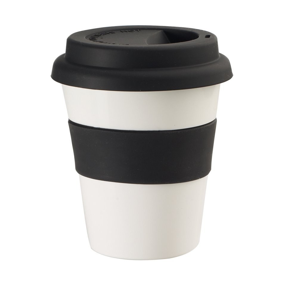 Bicchiere in plastica singola parete con fascia in silicone e coperchio a pressione. Capacità 350ml.