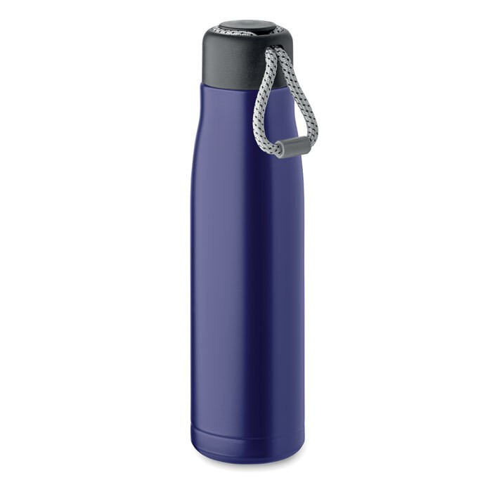 Bottiglia sottovuoto isolata a doppio strato in acciaio inox riciclato (90% acciaio inox riciclato e 10% acciaio inox) con impugnatura a corda integrata sul coperchio in PP.