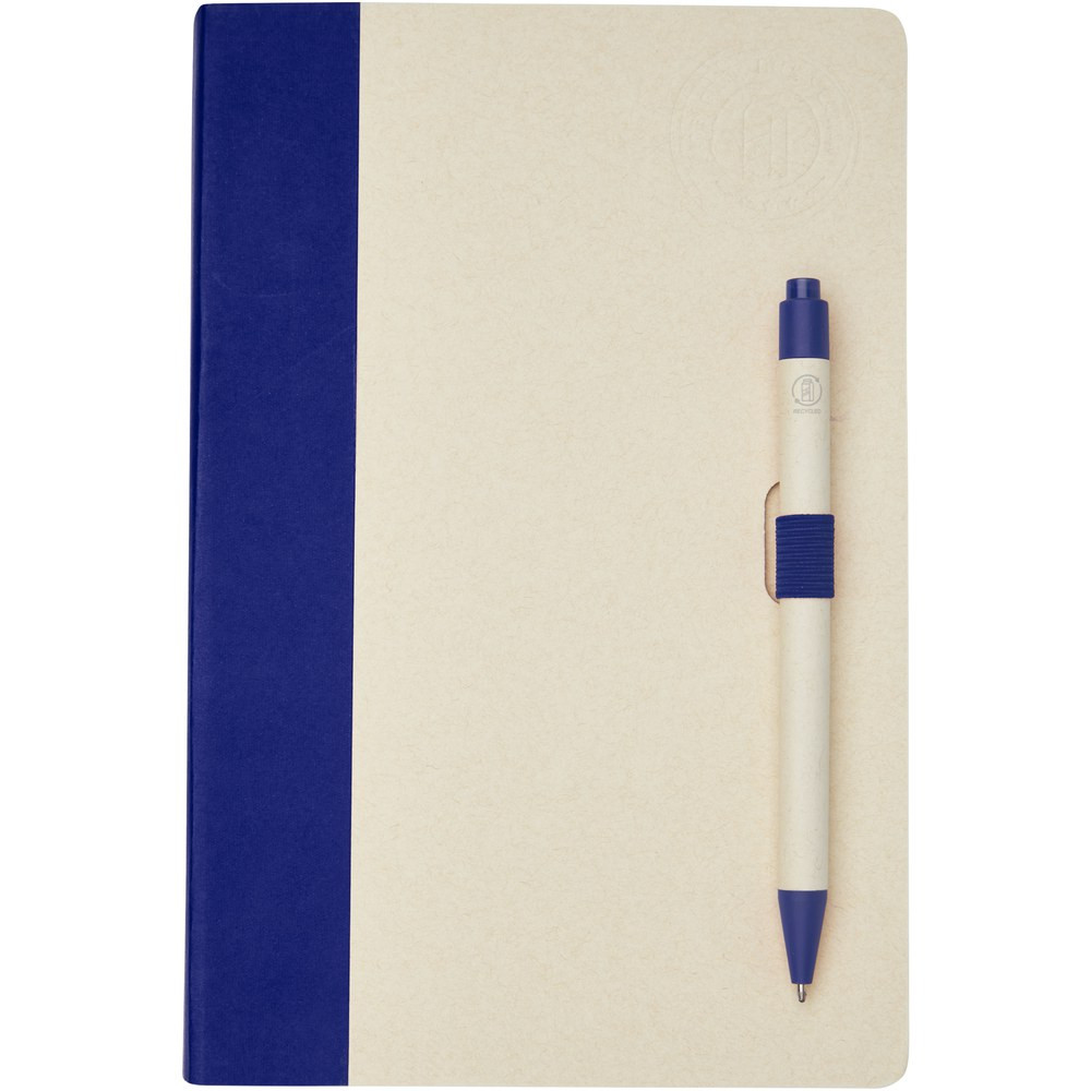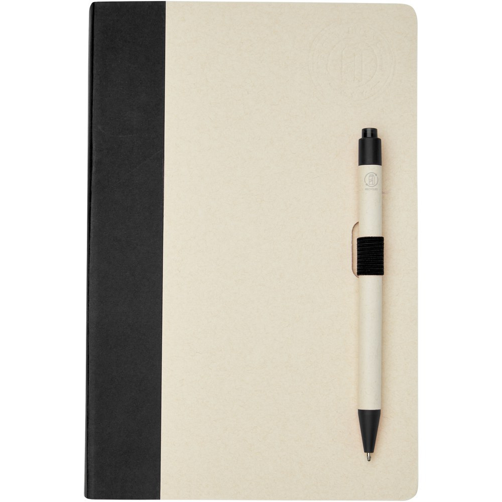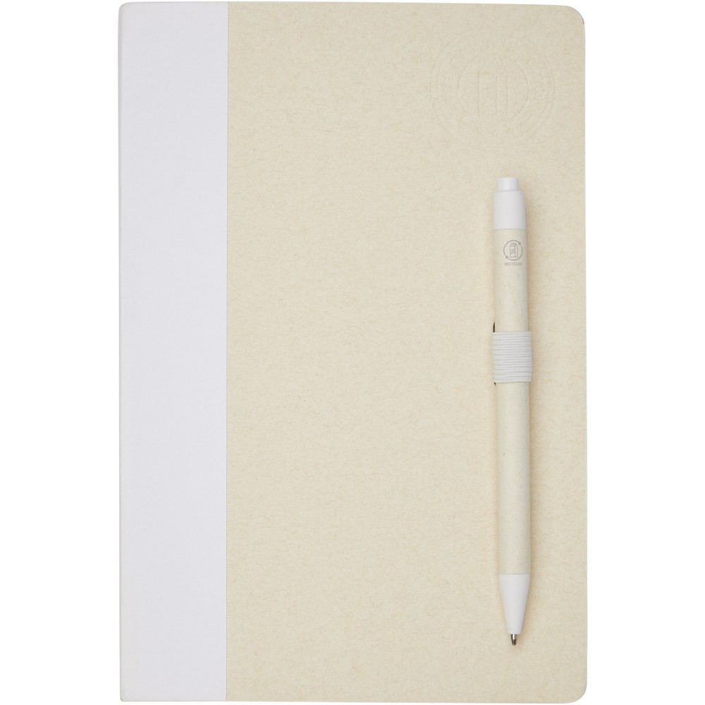 Set composto da blocco note in formato A5 e penna a sfera. Il blocco note presenta 80 fogli a righe (80 g/m²) realizzati con cartoni del latte riciclati (fino al 70%), con dorso in carta colorata e un portapenne. Il portapenne contiene penna a sfera con meccanismo a scatto abbinata al colore del blocco note. La penna ha un fusto realizzato con lo stesso materiale del cartone del latte riciclato e il pulsante, la clip e la punta sono in plastica PLA colorata. La penna è dotata di una ricarica di inchiostro nero all'interno. I cartoni del latte usati vengono raccolti, selezionati, lavorati e trasformati in carta, trasformando un semplice rifiuto in qualcosa di utile.