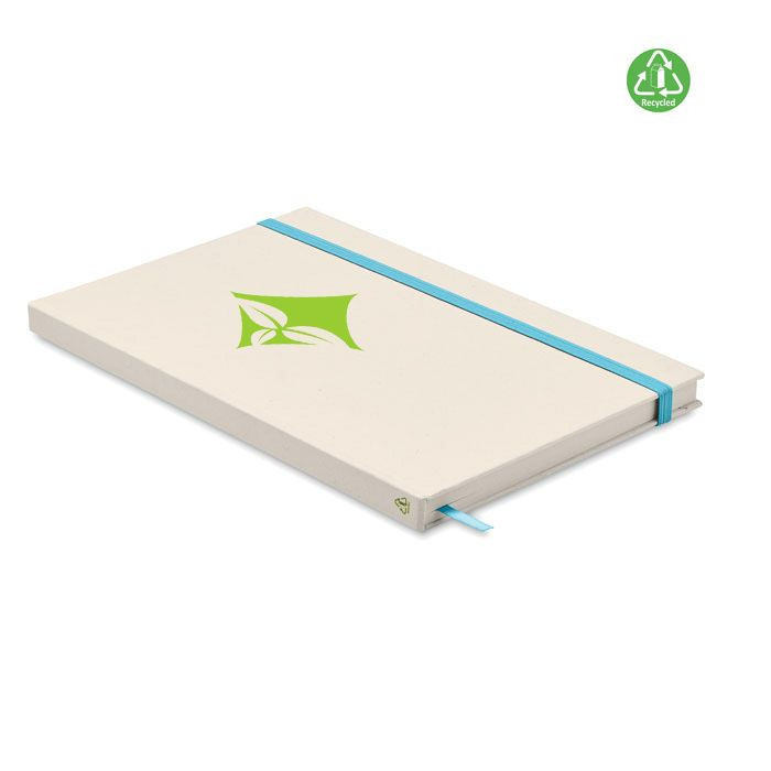 Notebook A5 con copertina rigida e 160 pagine a righe (80 fogli da 80 gr/m²) in confezione di cartone del latte riciclato al 70% e carta riciclata al 30%.