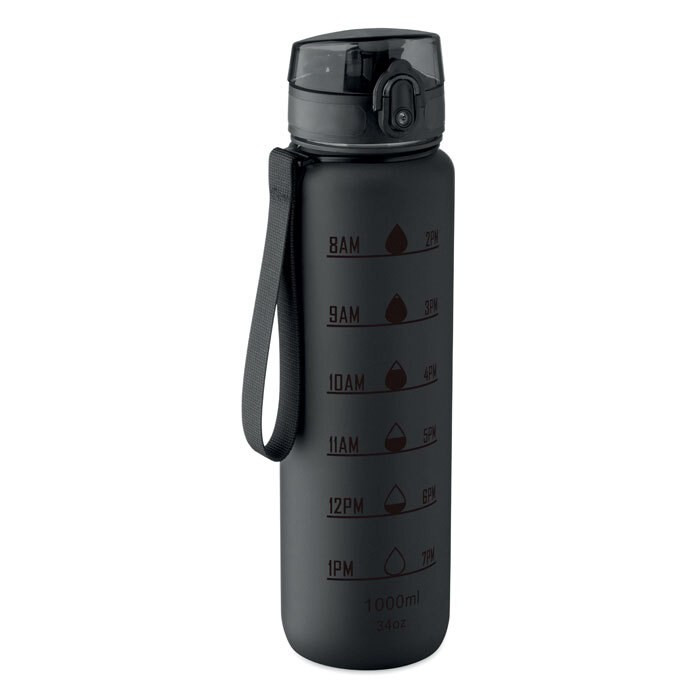 Borraccia sportiva in RPET, con indicatori di tempo motivazionali, coperchio flip top apribile con una sola mano, chiusura di sicurezza e cinghia di trasporto.