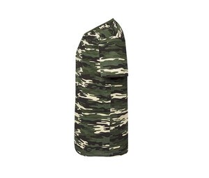 Taglio tubolare (cuciture laterali sul colore camouflage). Doppia impuntura su collo, spalle e vita. Fettuccia sul collo da spalla a spalla. Collo con costina in elastan.