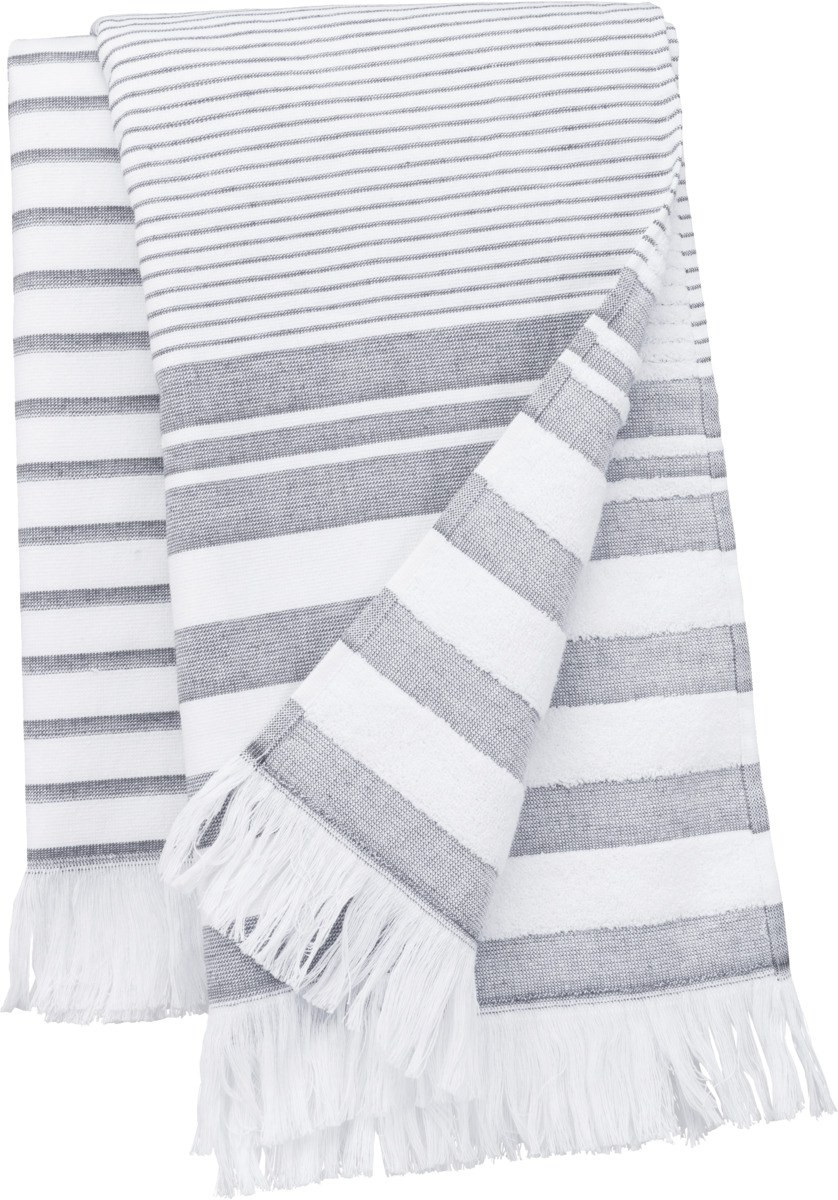 È disponibile in graziose fantasie a righe bianche e fumé con una finitura sfrangiata che quasi si scambierebbe per una grande sciarpa, ma che ha tutte le qualità di un classico asciugamano.