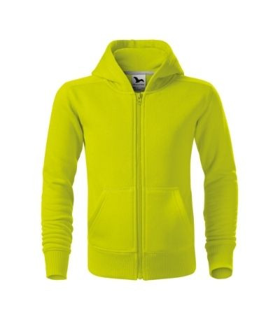 Ha una vestibilità dritta con cuciture laterali e una cerniera in plastica a tutta lunghezza. Il cappuccio ha una fodera interna e non ha un cordoncino. La scollatura interna posteriore è in contrasto per un look casual. Le tasche frontali applicate a canguro sono pratiche, e il bambino può mettere vari oggetti o le mani all'interno quando fa freddo. La felpa ha l'orlo inferiore e i polsini in tessuto a costine 2:2, composto al 5% di elastan. Poiché questa parte è spesso manipolata, è importante aver scelto un materiale di questo tipo per garantirne la solidità nel tempo. La parte interna è spazzolata.