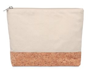 Portacosmetici in cotone 220gr con dettagli in sughero sul fondo.