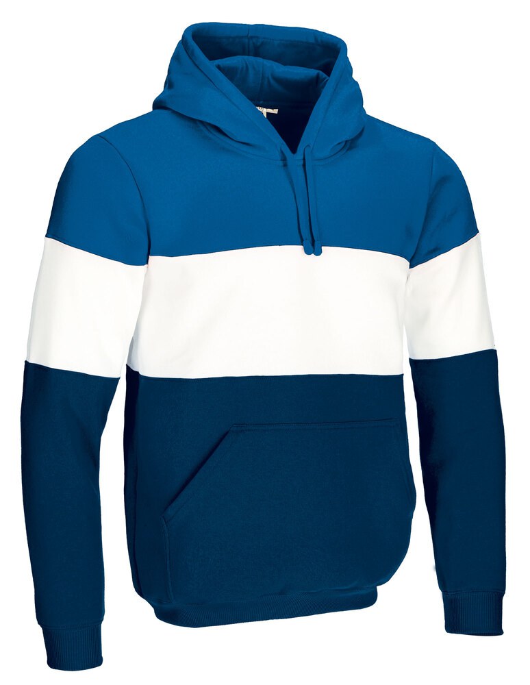 Felpa con cappuccio, tasca a canguro e disegno tricolore. Realizzata in poliestere e cottonfeel e garzato interno per una migliore ritenzone termica e confort. Formata da diverse bande di colore applicate con doppie cucite per una migliore finitura. Cappuccio a doppio strato con lacci regolabili per una miglior vestibilitá, vita e polsini a costine elasticizzate che si adattano comodamente.Ampia tasca frontale a canguro per avere tutto accessibile e per proteggere le mani. Metodi di personalizzazione idonei: serigrafia, riamo, trasferimento, patch. Ideale come abbigliamento promozionale, merchandising e abbigliamento casual.