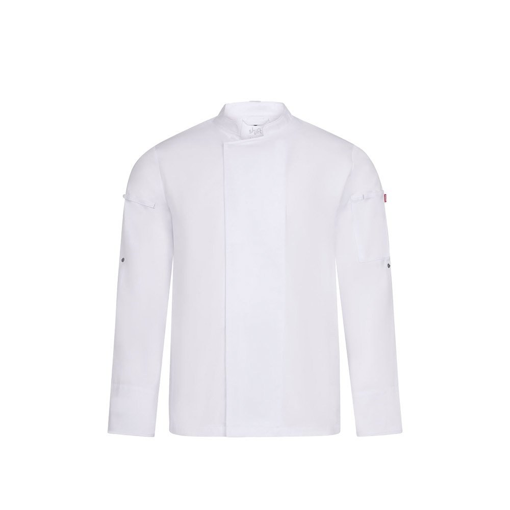 Giacca da cucina unisex (190 g/m²), realizzata in cotone (35%) e poliestere riciclato (65%). Caratterizzata da un design confortevole, tessuto idrorepellente e morbido al tatto, e tessuto traspirante COOLMAX sul retro. La giacca ha una chiusura centrale con cerniera e bottoni nascosti. Taglia: S, M, L, XL, 2XL, 3XL